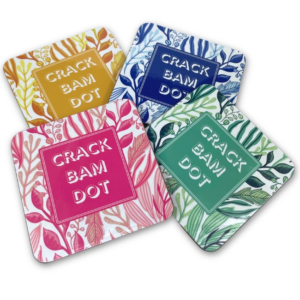 These are 4×4″ each, and the set is packaged in a clear plastic box with our brand on the back. The pink coaster is on the top of the stack and showing on the package.